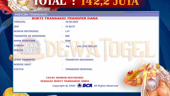 DEWATOGEL mengucapkan selamat kepada user id : HAR*** yang telah berhasil mendapatkan jackpot pada permainan SLOT DI SWEET BONANZA. Kemenangan sebesar Rp 142.250.000,-. telah dibayarkan LUNAS oleh pihak dewatogel kepada pemilik user id setelah yang bersangkutan mengisi formulir withdraw. Proses pencairan dana berlangsung sangat cepat hanya dalam waktu 5-10 menit sudah berada dalam rekening pemilik user id. Bukti transfer yang dapat anda lihat adalah bukti SAH / VALID yang langsung di dapatkan melalui bukti transaksi dari Bank yang digunakan untuk pengiriman dana pada rekening pemilik user id. Terima kasih kami sampaikan kepada para pengguna setia DEWATOGEL yang telah menggunakan situs kami, sebagai Bandar Terpercaya yang pastinya membayar semua kemenangan member hingga lunas. Apakah DEWATOGEL PENIPU ? Reputasi “DEWATOGEL TERPERCAYA” sudah sangat melekat. puluhan hingga ratusan ribu pengguna setia DEWATOGEL tetap menggunakan situs terbesar dan terbaik di Indonesia ini. Hapus rasa was-was dan khawatir anda, kemenangan anda berapapun PASTI dibayarkan hingga lunas.